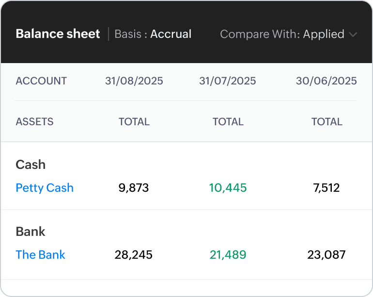 See your business performance at a glance. The Zoho Books dashboard provides a quick snapshot of your financial health, including cash flow, payables, receivables, tax liabilities, and more.